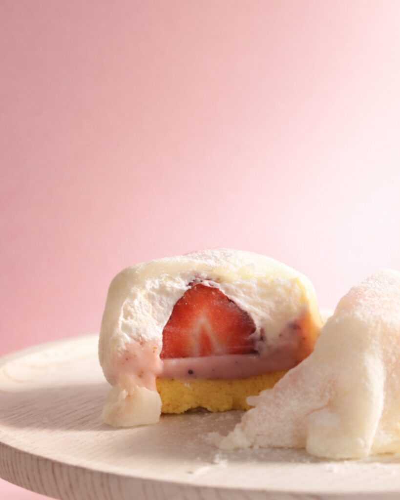 やわらかな牛皮をそっと持ち上げると、中には軽やかな生クリームと、春を運ぶほんのりピンクの桜クリーム。 一口食べれば、はちみつを贅沢にきかせたしっとり生地のコクが、口いっぱいに広がります。
